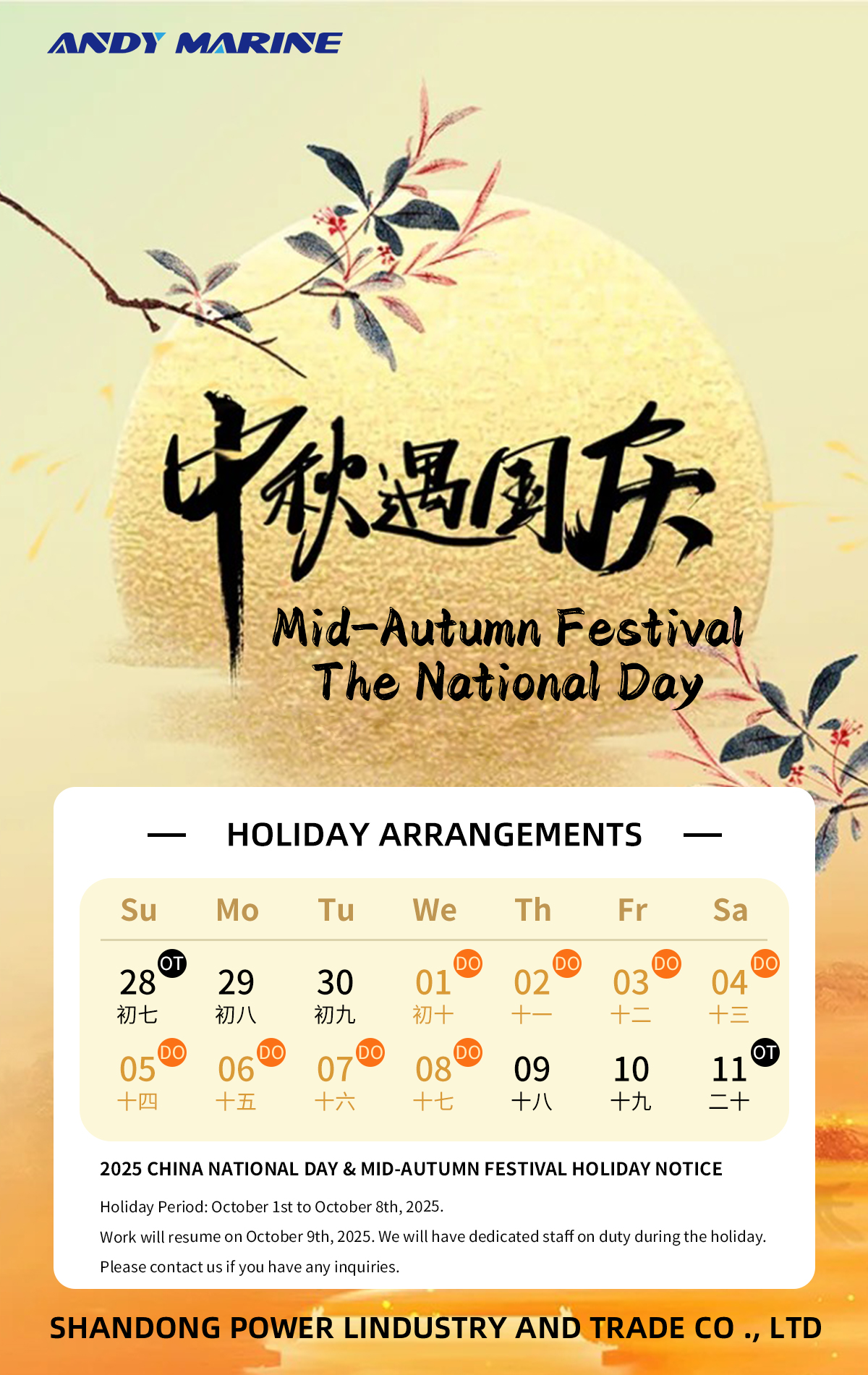 တရုတ်နိုင်ငံ၏အမျိုးသားနေ့နီးကပ်လာသည်နှင့်အမျှ Andy Marine ၏အစီအစဉ်သည်အောက်ပါအတိုင်းဖြစ်သည် -
